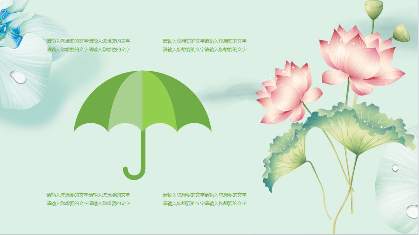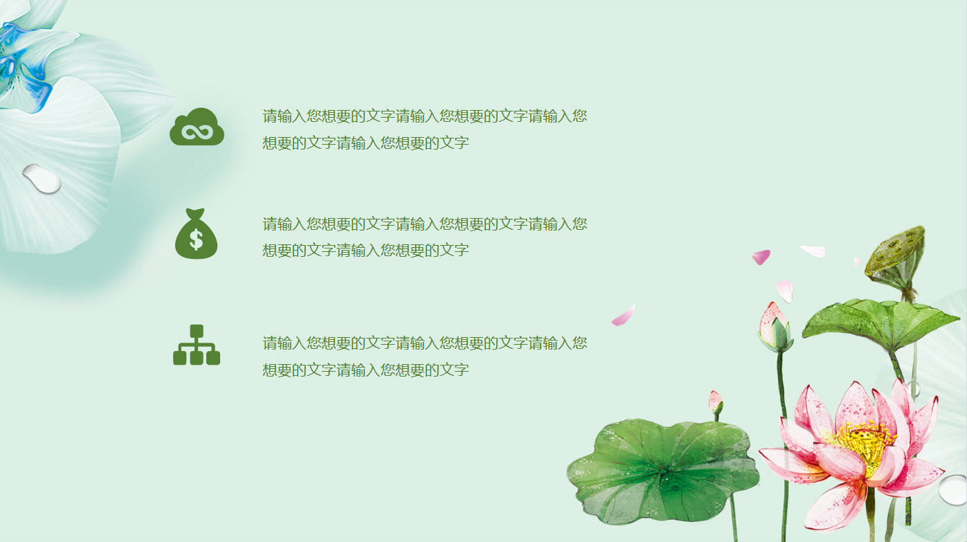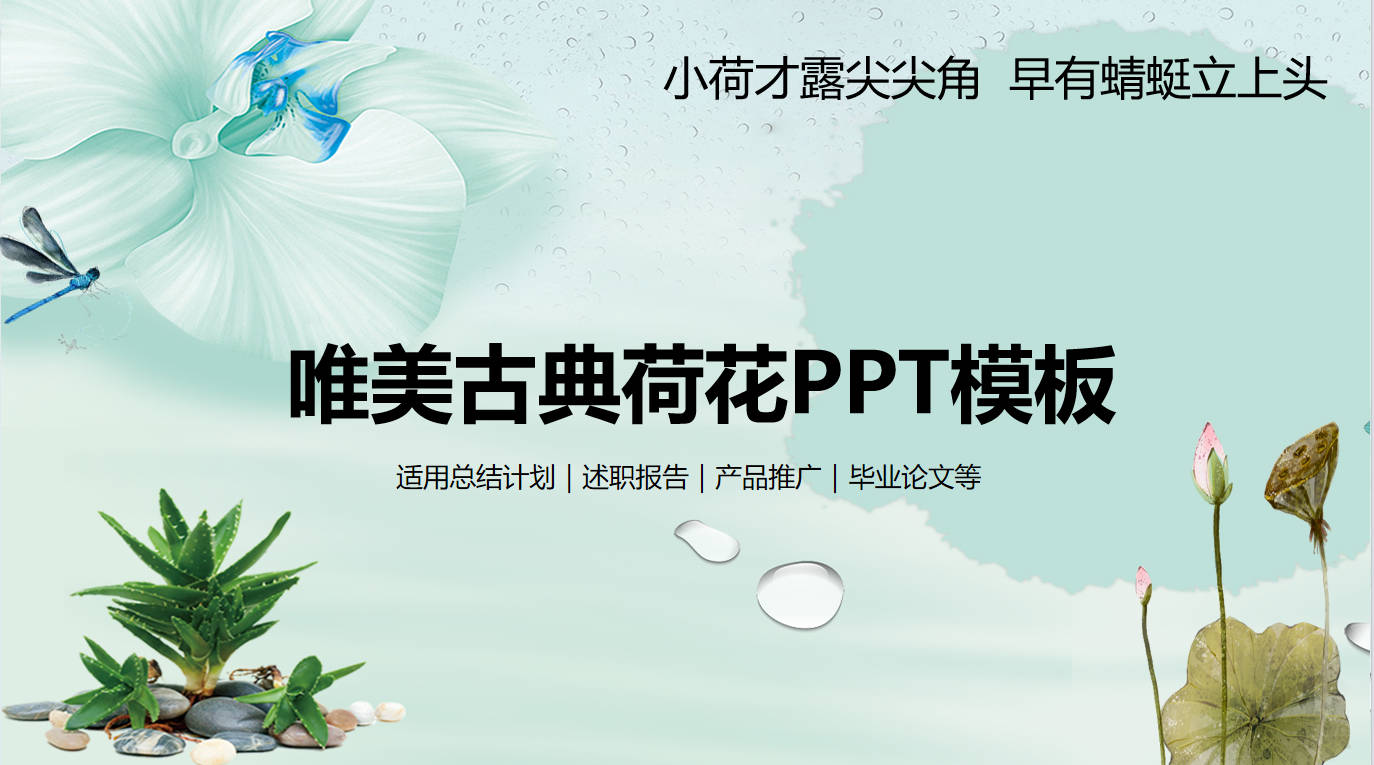 本作品内容为唯美中国风说课课件古典荷花PPT模板, 格式为 pptx, 大小15 MB, 页数为26,比例16:9, 请使用软件PowerPoint(2010)打开, 作品中主体文字及图片可替换修改,文字修改可直接点击文本框进行编辑,图片更改可选中图片后单击鼠标右键选择更换图片,也可根据自身需求增加和删除作品中的内容, 源文件无水印, 欢迎使用。 如认为平台内容涉嫌侵权,可通过邮件提出书面通知,我们将及时处理。
