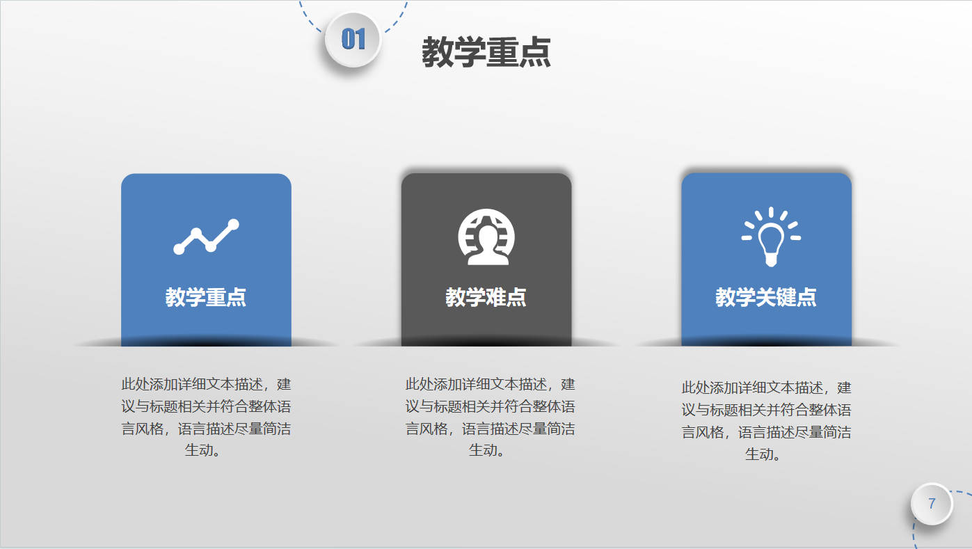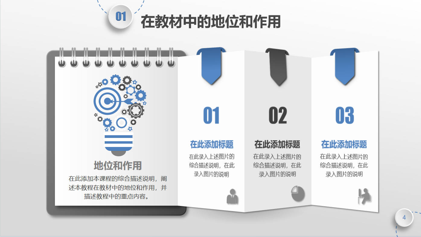 本作品内容为蓝色清新微立体说课公开课件PPT模板, 格式为 pptx, 大小3 MB, 页数为32,比例16:9, 请使用软件PowerPoint(2010)打开, 作品中主体文字及图片可替换修改,文字修改可直接点击文本框进行编辑,图片更改可选中图片后单击鼠标右键选择更换图片,也可根据自身需求增加和删除作品中的内容, 源文件无水印, 欢迎使用。 如认为平台内容涉嫌侵权,可通过邮件提出书面通知,我们将及时处理。
