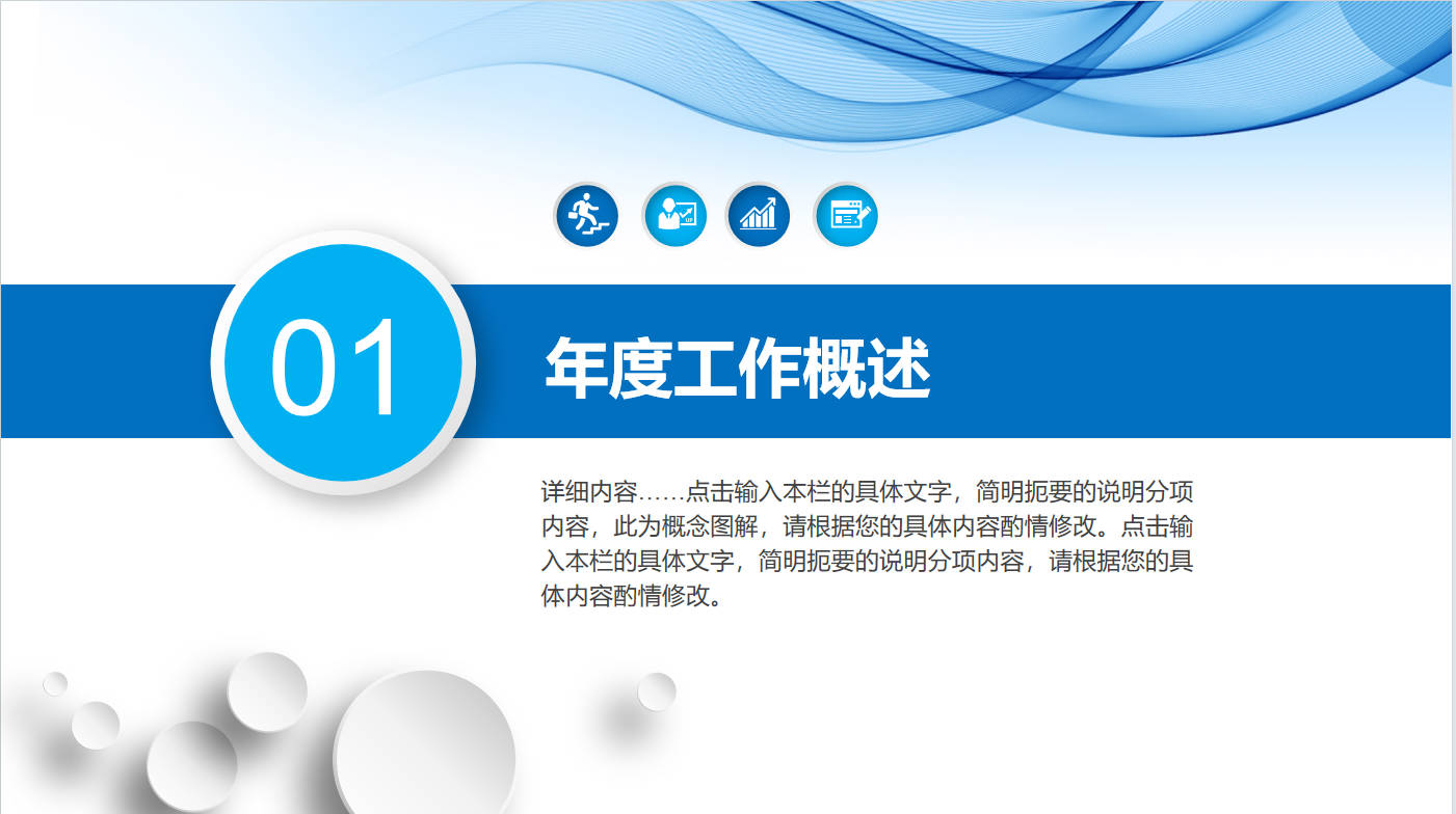 本作品内容为蓝色简约风2025年终工作总结通用PPT模板, 格式为 pptx, 大小8 MB, 页数为61,比例16:9, 请使用软件PowerPoint(2010)打开, 作品中主体文字及图片可替换修改,文字修改可直接点击文本框进行编辑,图片更改可选中图片后单击鼠标右键选择更换图片,也可根据自身需求增加和删除作品中的内容, 源文件无水印, 欢迎使用。 如认为平台内容涉嫌侵权,可通过邮件提出书面通知,我们将及时处理。