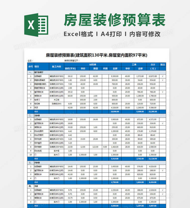 本作品内容为房屋装修预算表, 格式为 xlsx, 大小1 MB, 请使用软件Excel(2016)打开, 作品中主体文字及图片可替换修改,文字修改可直接点击文本框进行编辑,图片更改可选中图片后单击鼠标右键选择更换图片,也可根据自身需求增加和删除作品中的内容, 源文件无水印, 欢迎使用。 如认为平台内容涉嫌侵权,可通过邮件提出书面通知,我们将及时处理。