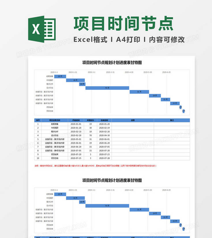 本作品内容为项目时间节点规划计划进度表甘特图Excel模板, 格式为 xlsx, 大小1 MB, 请使用软件Excel(2016)打开, 作品中主体文字及图片可替换修改,文字修改可直接点击文本框进行编辑,图片更改可选中图片后单击鼠标右键选择更换图片,也可根据自身需求增加和删除作品中的内容, 源文件无水印, 欢迎使用。 如认为平台内容涉嫌侵权,可通过邮件提出书面通知,我们将及时处理。