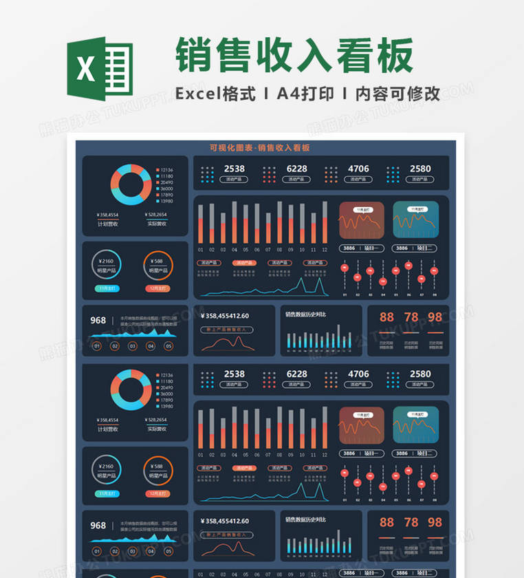 本作品内容为可视化图表-销售收入看板Execl模板, 格式为 xlsx, 大小1 MB, 请使用软件Excel(2016)打开, 作品中主体文字及图片可替换修改,文字修改可直接点击文本框进行编辑,图片更改可选中图片后单击鼠标右键选择更换图片,也可根据自身需求增加和删除作品中的内容, 源文件无水印, 欢迎使用。 如认为平台内容涉嫌侵权,可通过邮件提出书面通知,我们将及时处理。