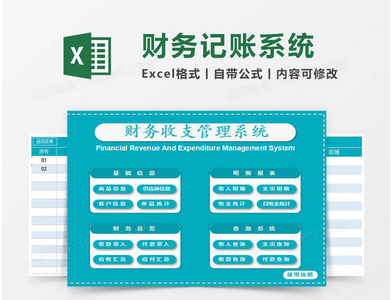 本作品内容为财务记账管理系统, 格式为 xlsx, 大小1 MB, 请使用软件Excel(2010)打开, 作品中主体文字及图片可替换修改,文字修改可直接点击文本框进行编辑,图片更改可选中图片后单击鼠标右键选择更换图片,也可根据自身需求增加和删除作品中的内容, 源文件无水印, 欢迎使用。 如认为平台内容涉嫌侵权,可通过邮件提出书面通知,我们将及时处理。