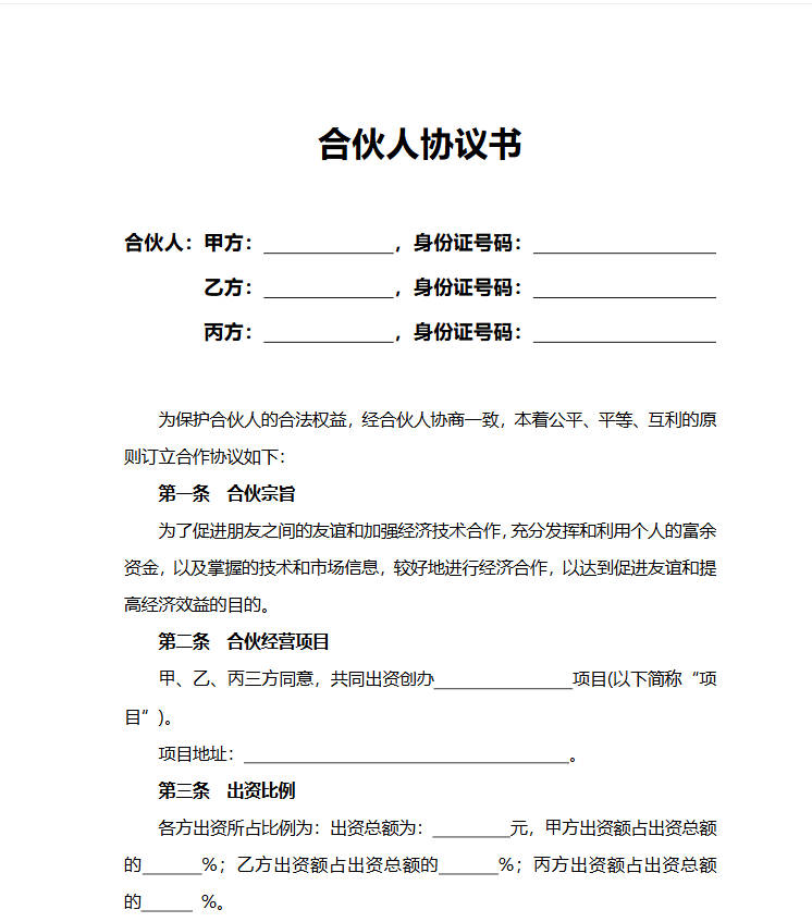 本作品内容为简单合伙人协议书word模板, 格式为 docx, 大小1 MB, 页数为6, 请使用软件Word(2019)打开, 作品中主体文字及图片可替换修改,文字修改可直接点击文本框进行编辑,图片更改可选中图片后单击鼠标右键选择更换图片,也可根据自身需求增加和删除作品中的内容, 源文件无水印, 欢迎使用。 如认为平台内容涉嫌侵权,可通过邮件提出书面通知,我们将及时处理。