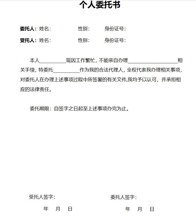 本作品内容为通用实用个人委托书word模板, 格式为 docx, 大小2 MB, 页数为1, 请使用软件Word(2019)打开, 作品中主体文字及图片可替换修改,文字修改可直接点击文本框进行编辑,图片更改可选中图片后单击鼠标右键选择更换图片,也可根据自身需求增加和删除作品中的内容, 源文件无水印, 欢迎使用。 如认为平台内容涉嫌侵权,可通过邮件提出书面通知,我们将及时处理。