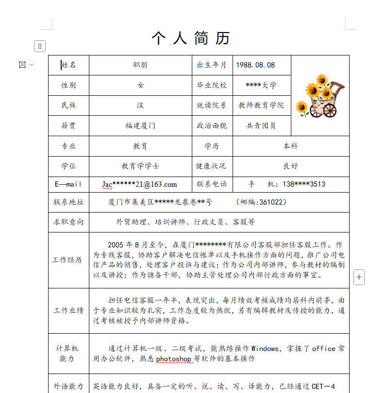 本作品内容求职简历word简历模板, 格式为 docx, 大小1 MB, 页数为1, 请使用软件Word(2016)打开, 作品中主体文字及图片可替换修改,文字修改可直接点击文本框进行编辑,图片更改可选中图片后单击鼠标右键选择更换图片,也可根据自身需求增加和删除作品中的内容, 源文件无水印, 欢迎使用。 如认为平台内容涉嫌侵权,可通过邮件提出书面通知,我们将及时处理。